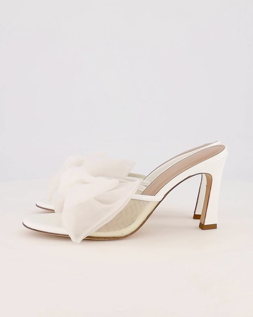 The ATANA Bow Mule 85 is a white bridal mule heel crafted from fine Italian leather and mesh. The design features a layered 3D mesh bow that adds structure and dimension, paired with an 8.5 cm (3.4 inch) Charleston heel for a clean, modern silhouette. The backless mule shape makes these bridal mule heels easy to slip on and ideal for wedding ceremonies, receptions, or bridal events.